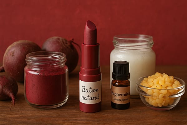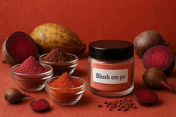 • Blush em pó natural (beterraba, cacau, urucum, amido)
